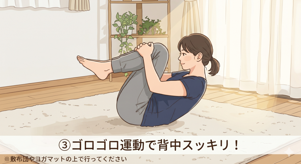 背骨周りの柔軟性を高めるのに効果的ですが、硬いフローリングで行うと背骨を痛めてしまう可能性があります。必ず敷布団やヨガマットなど、クッション性のある場所で実践してくださいね。