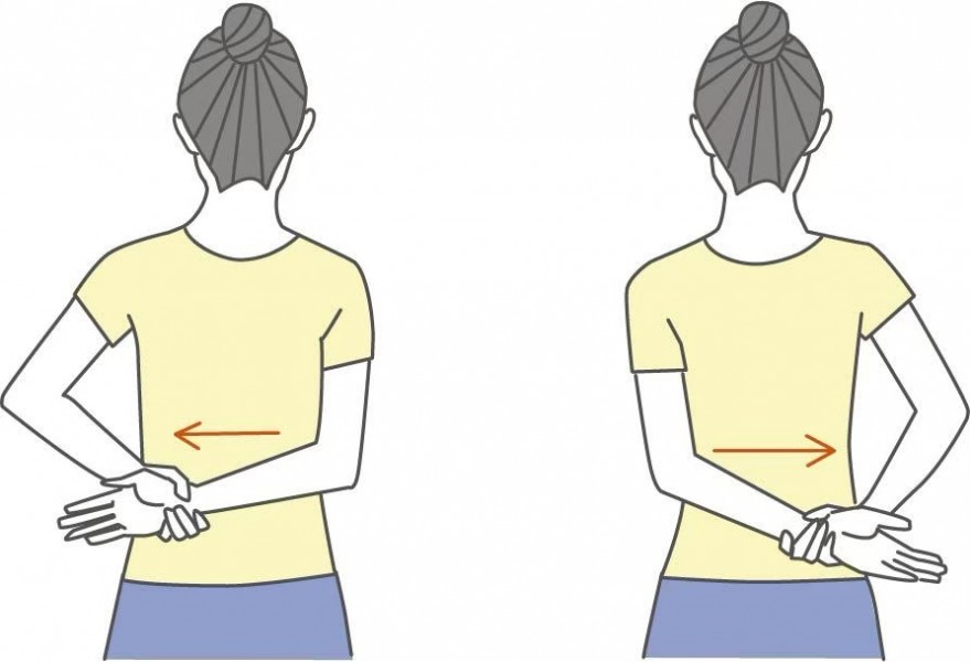 3つ目にご紹介するのは、腕を下ろした状態で手を後ろに伸ばし、外側・内側へねじる運動です。